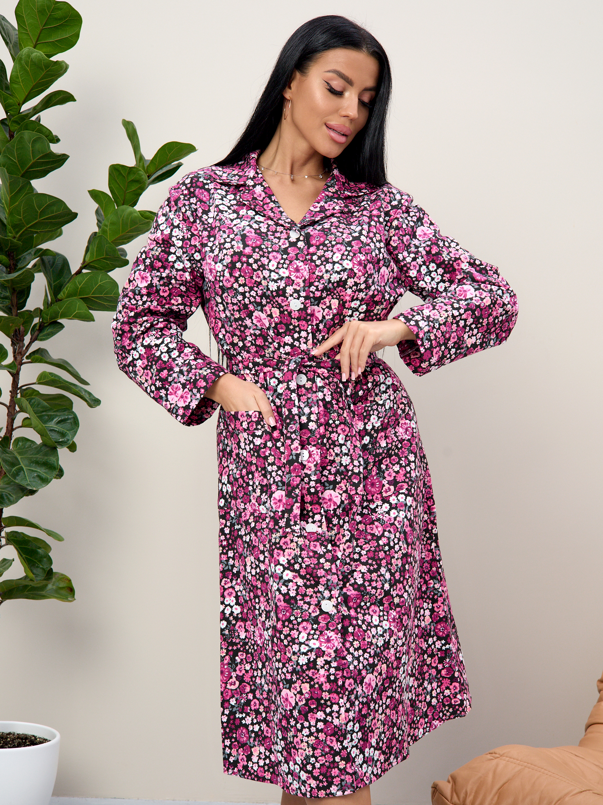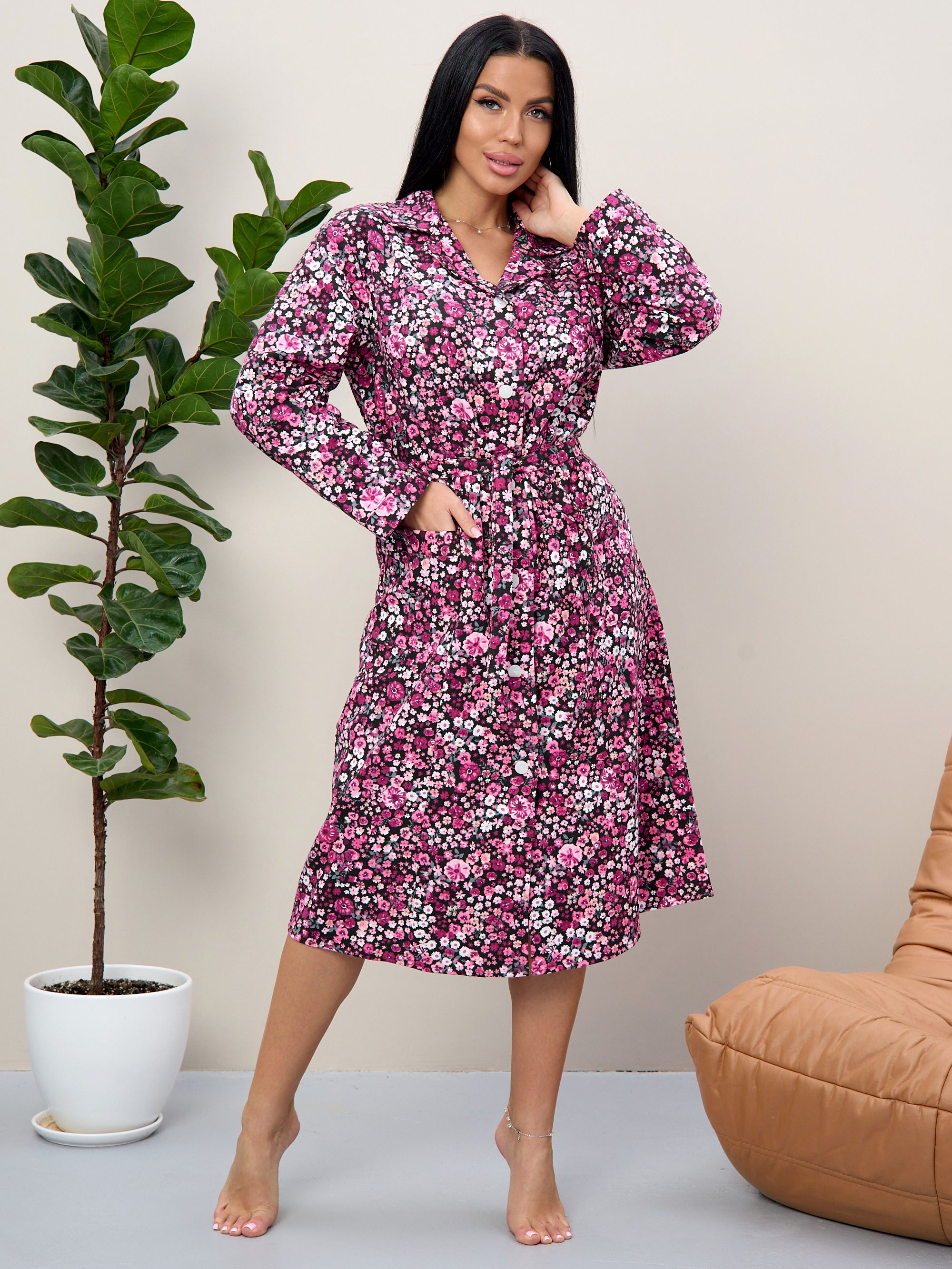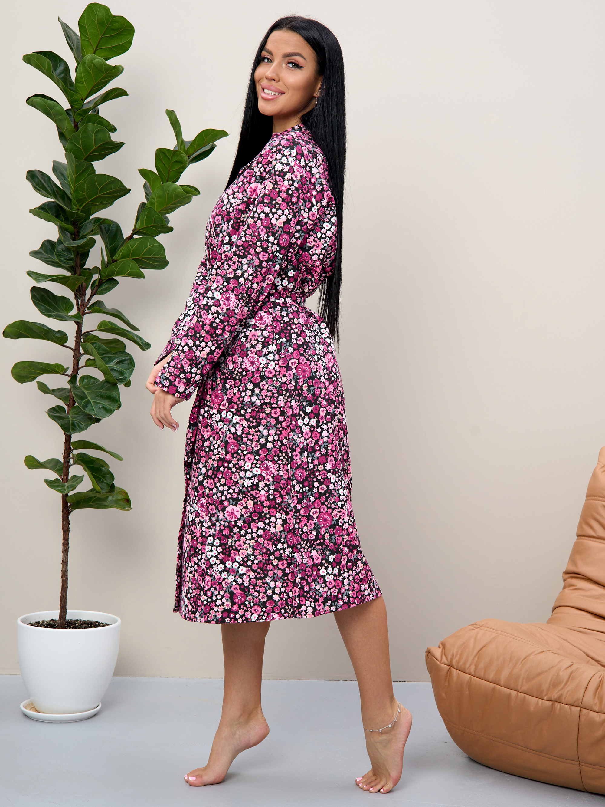 Халат прямой с рельефами, благодаря чему хорошо садится по фигуре, подчеркивая талию благодаря поясу.