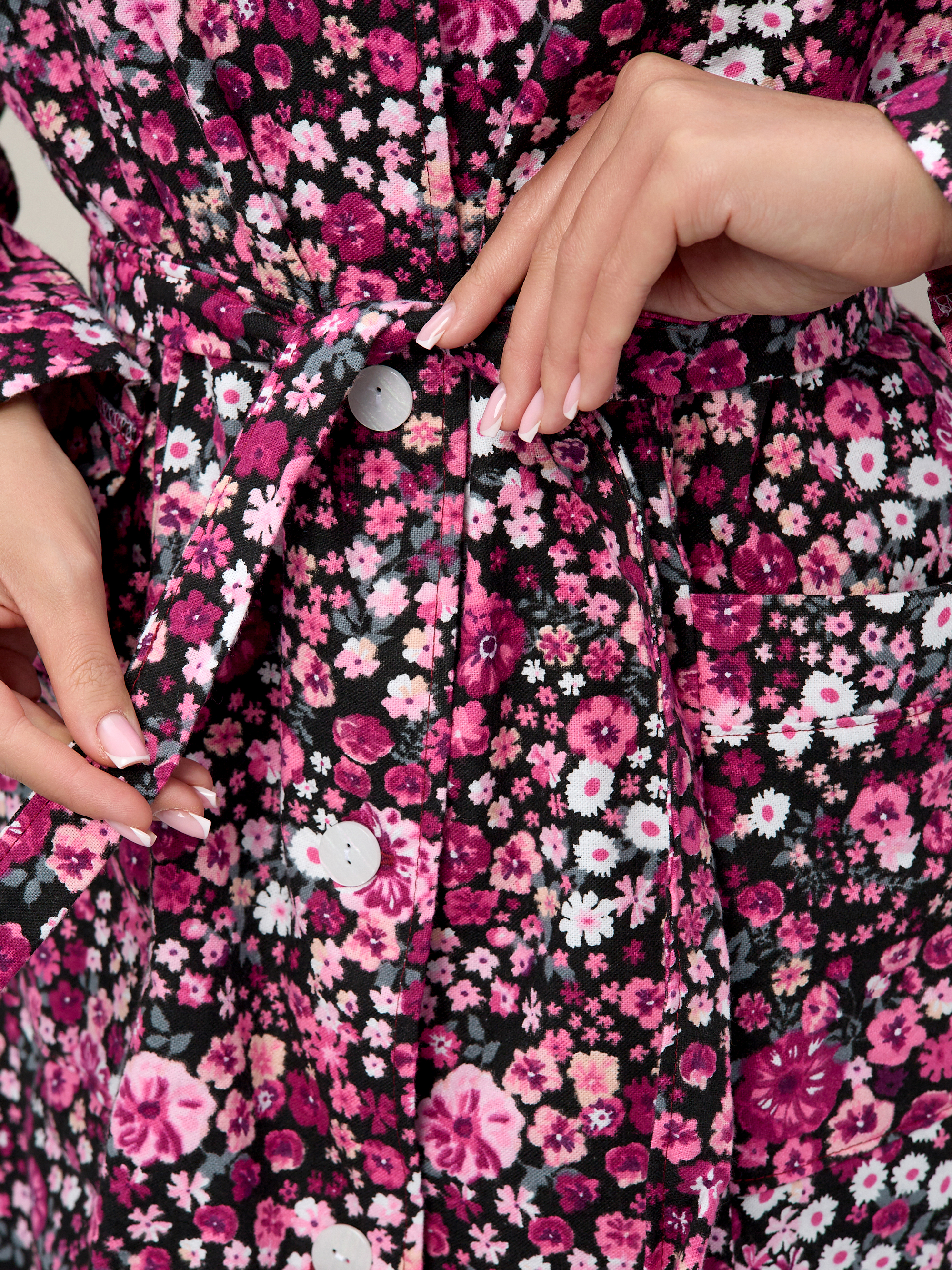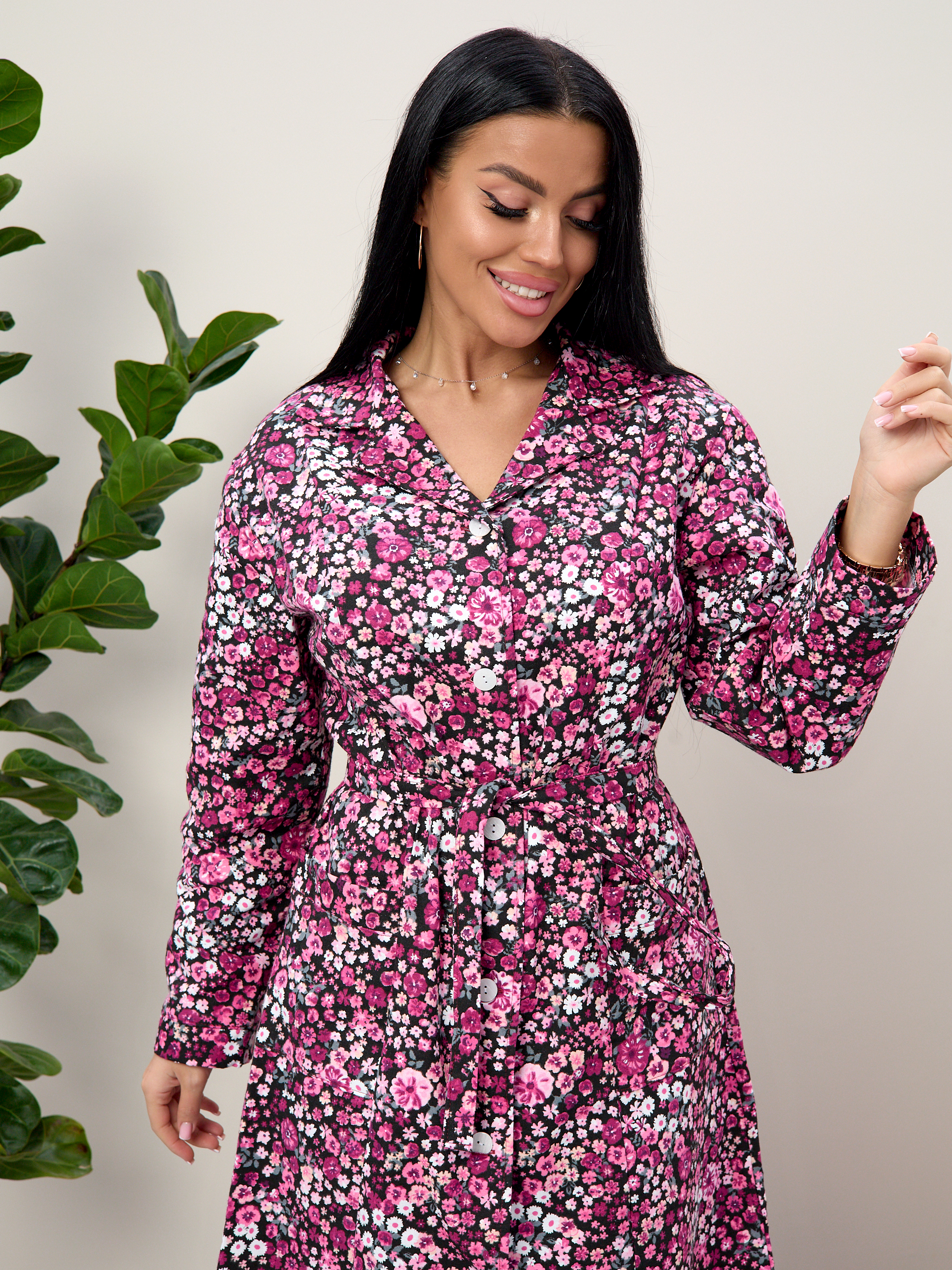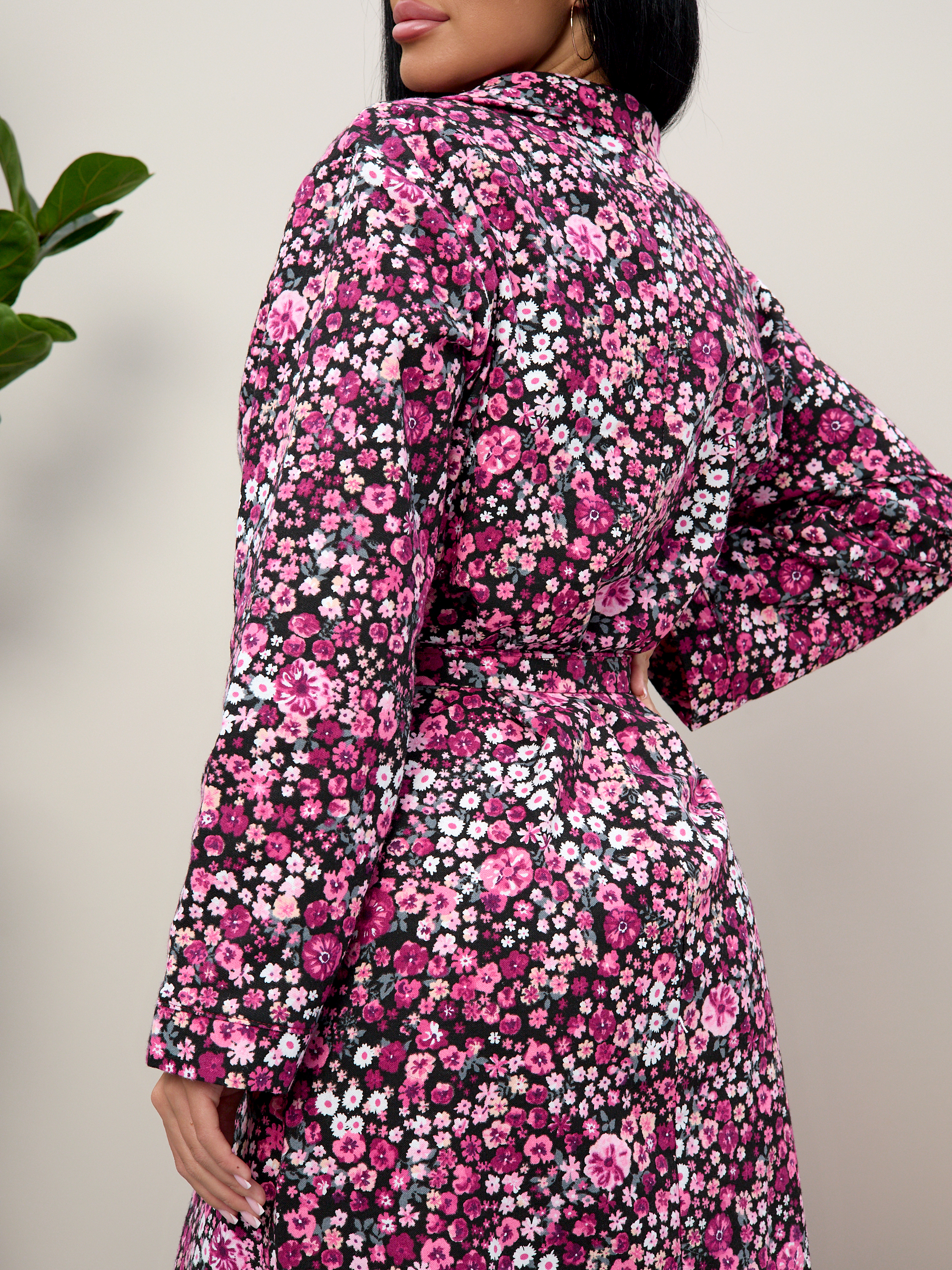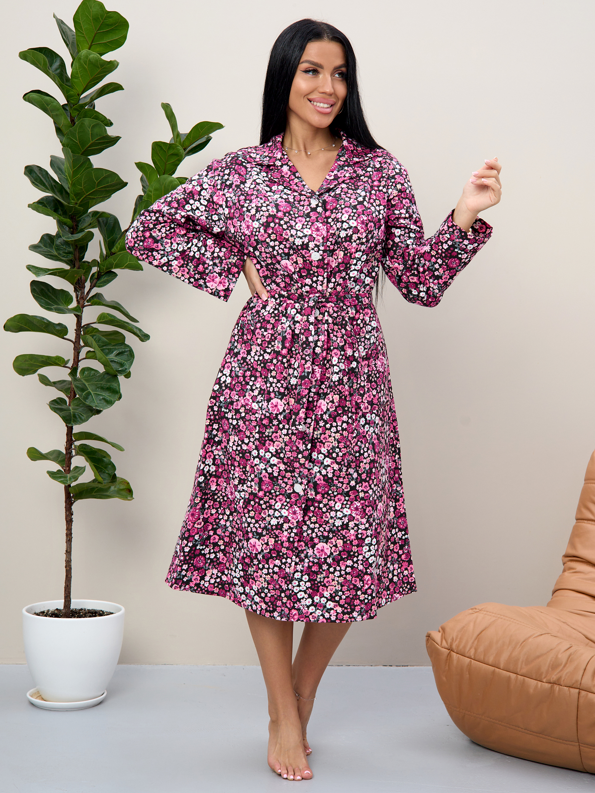 Халат прямой с рельефами, благодаря чему хорошо садится по фигуре, подчеркивая талию благодаря поясу.